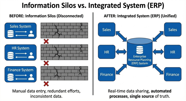 Siloed systems vs. integrated ERP: eliminating manual workflows and enabling real-time, unified operations. (Source: OCO)