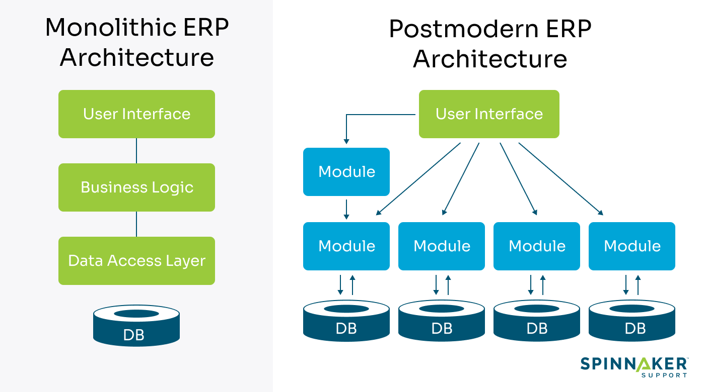 Legacy ERP system architecture showing monolithic modules and data silos (Source: Spinnaker Support)