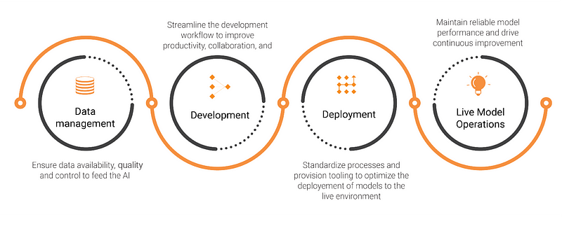 AI model lifecycle stages from data management to live operations, showing continuous improvement and retraining (Source: ML6)