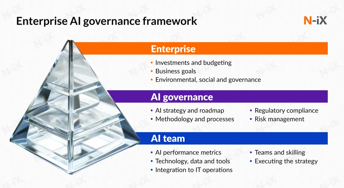 Enterprise AI governance framework connects strategy, compliance, and execution aligning technical AI operations with broader business goals. (Source: N-iX)