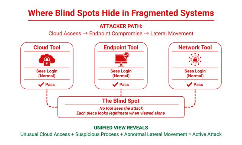 Blind spots formed when systems are monitored in isolation. (Source: Seceon)