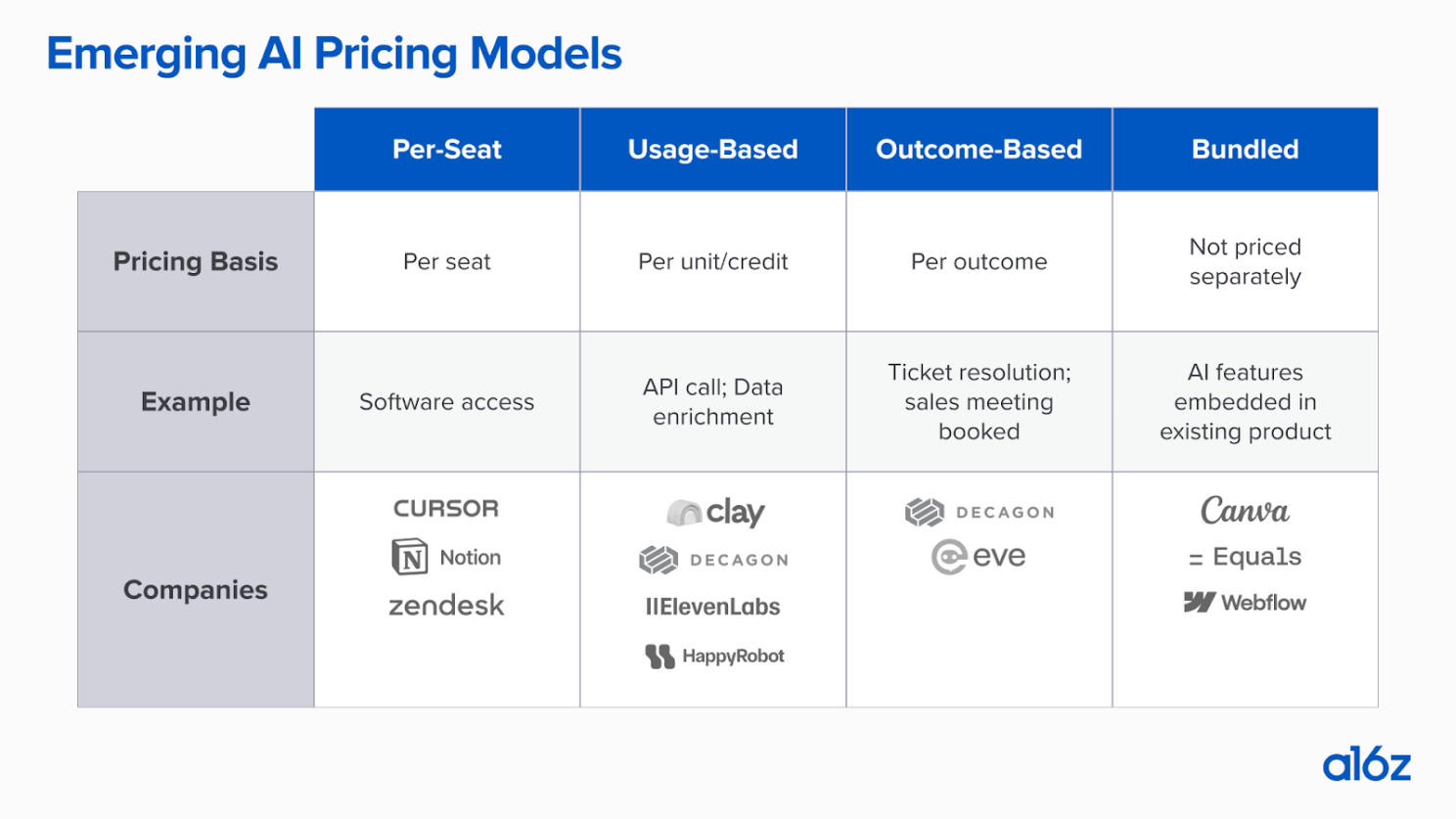 Comparison of SaaS pricing models per-seat, usage-based, outcome-based, and bundled (Source: a16z)