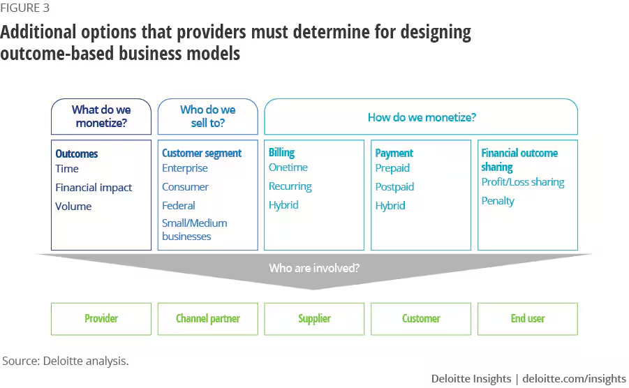 Key decision points in outcome-based pricing, including what to monetize, how to bill and which stakeholders to involve (Source: Deloitte Insights)