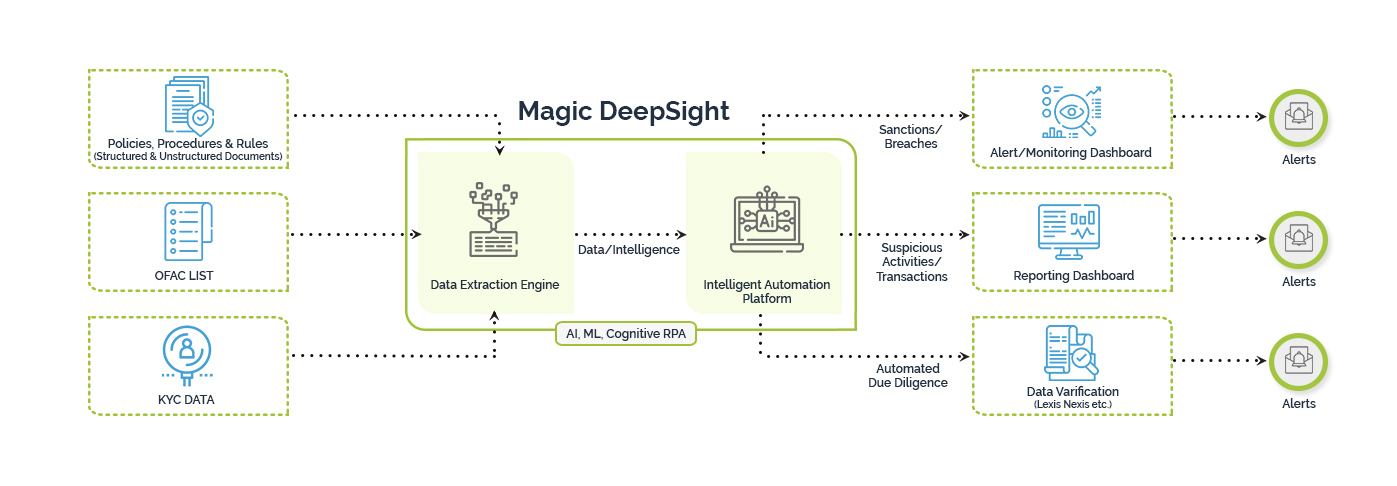 AI-driven KYC/AML workflow showing data ingestion, automated risk detection, and compliance monitoring. (source: Magic Finserv)